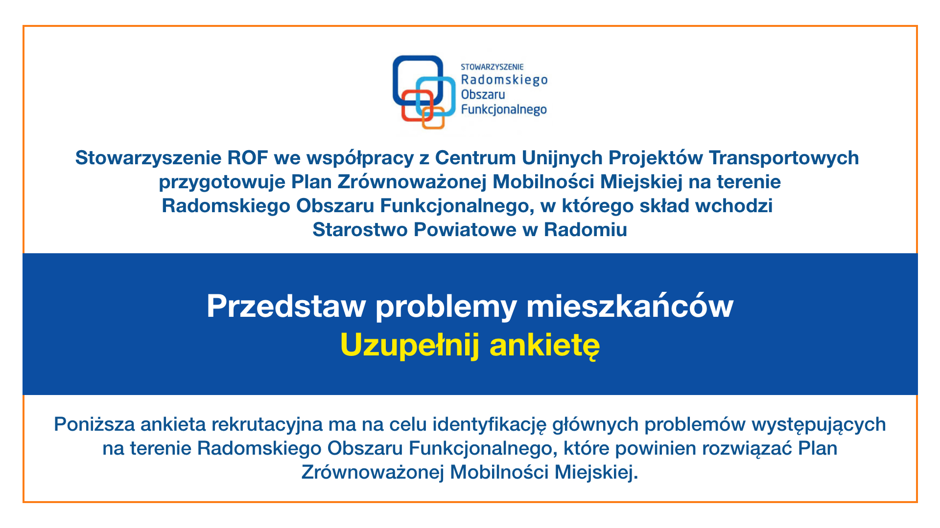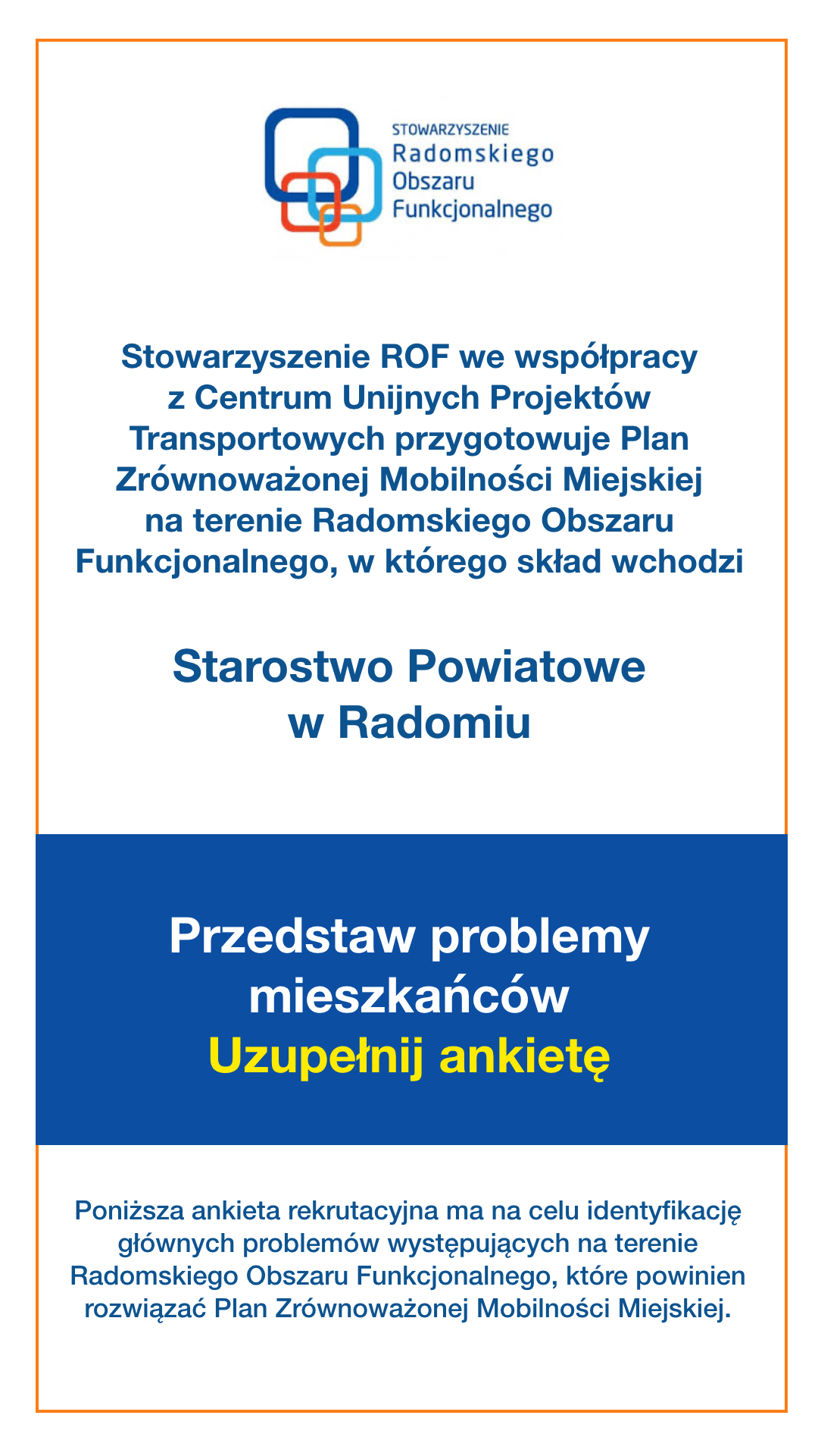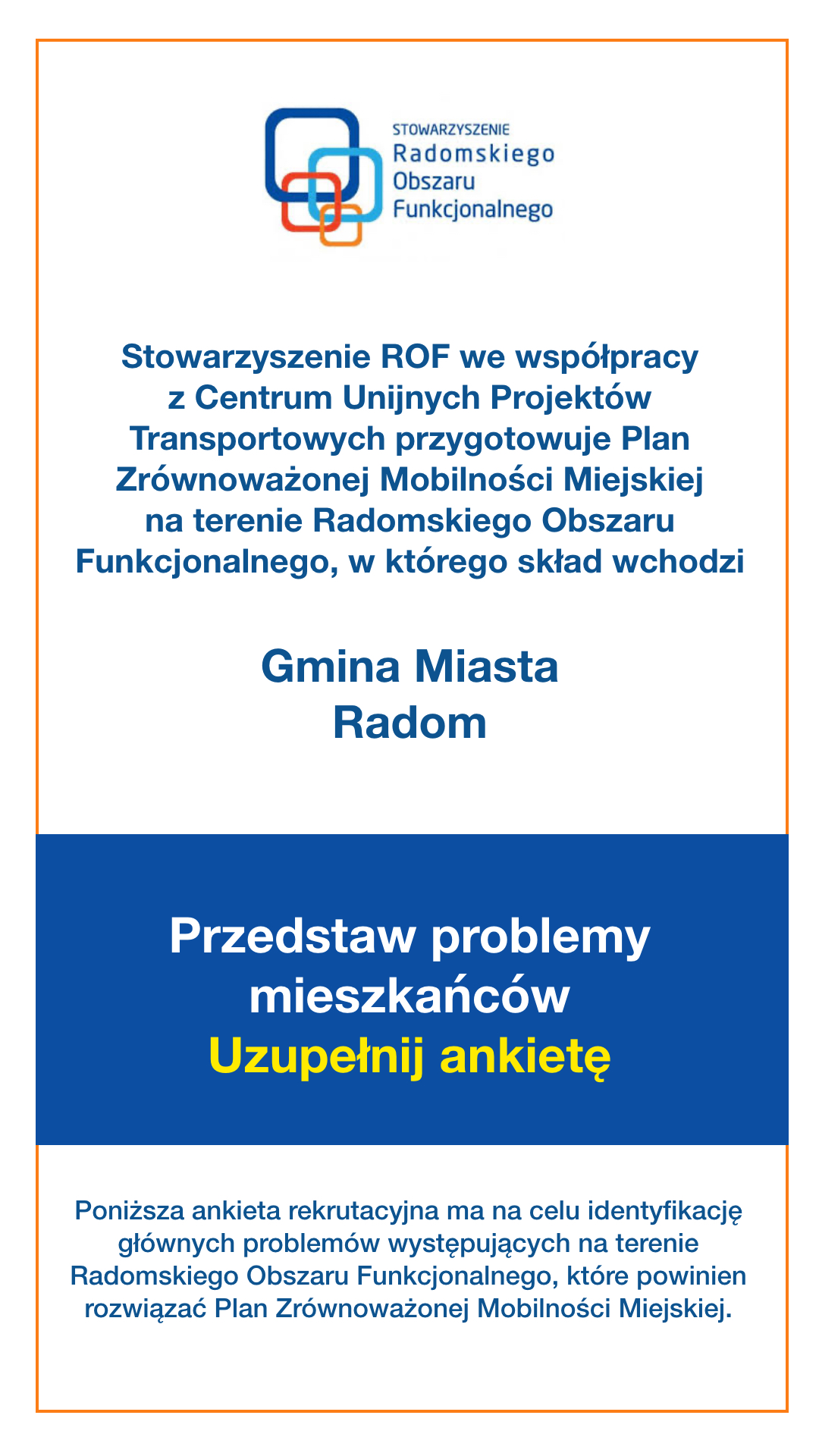 Stowarzyszenie Radomskiego Obszaru Funkcjonalnego we współpracy z Centrum Unijnych Projektów Transportowych przygotowuje Plan Zrównoważonej Mobilności Miejskiej. To dokument, który ma uwzględniać potrzeby komunikacyjne, a jednocześnie kwestie związane z ochroną środowiska. W opracowaniu planu, oprócz ekspertów, mają także uczestniczyć sami mieszkańcy. Dlatego została przygotowana ankieta kierowana do wszystkich zainteresowanych. Zawiera ona szereg pytań dotyczących istniejących rozwiązań komunikacyjnych,