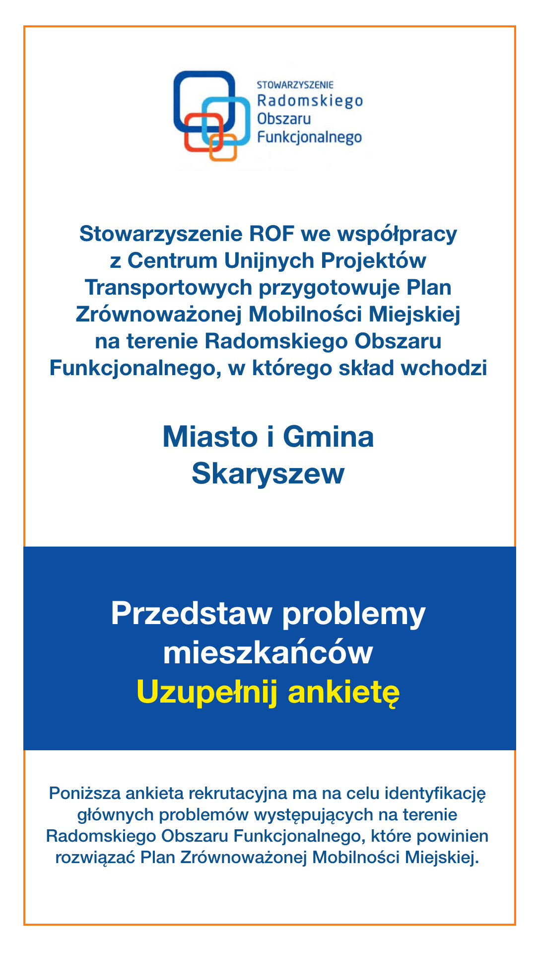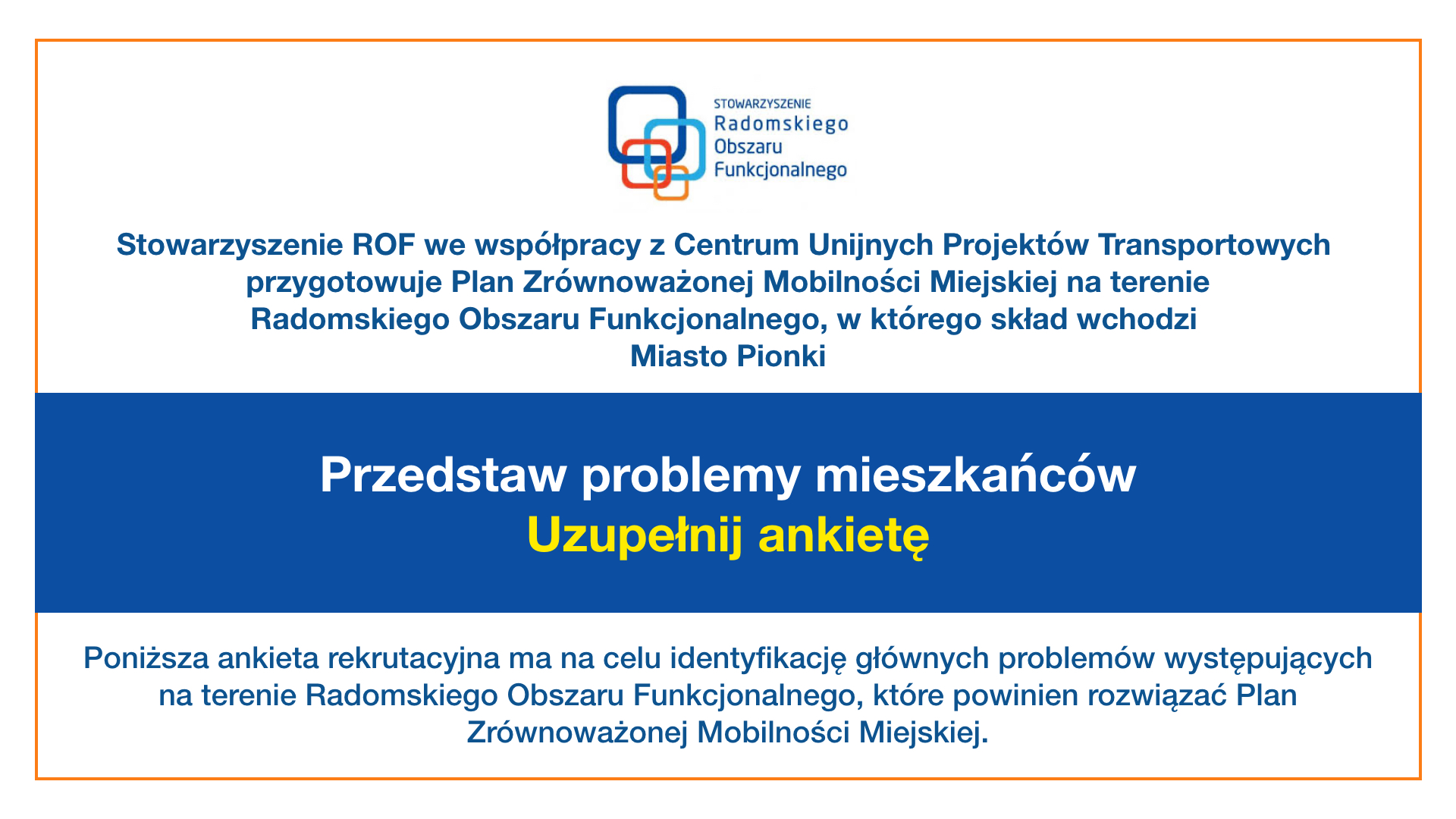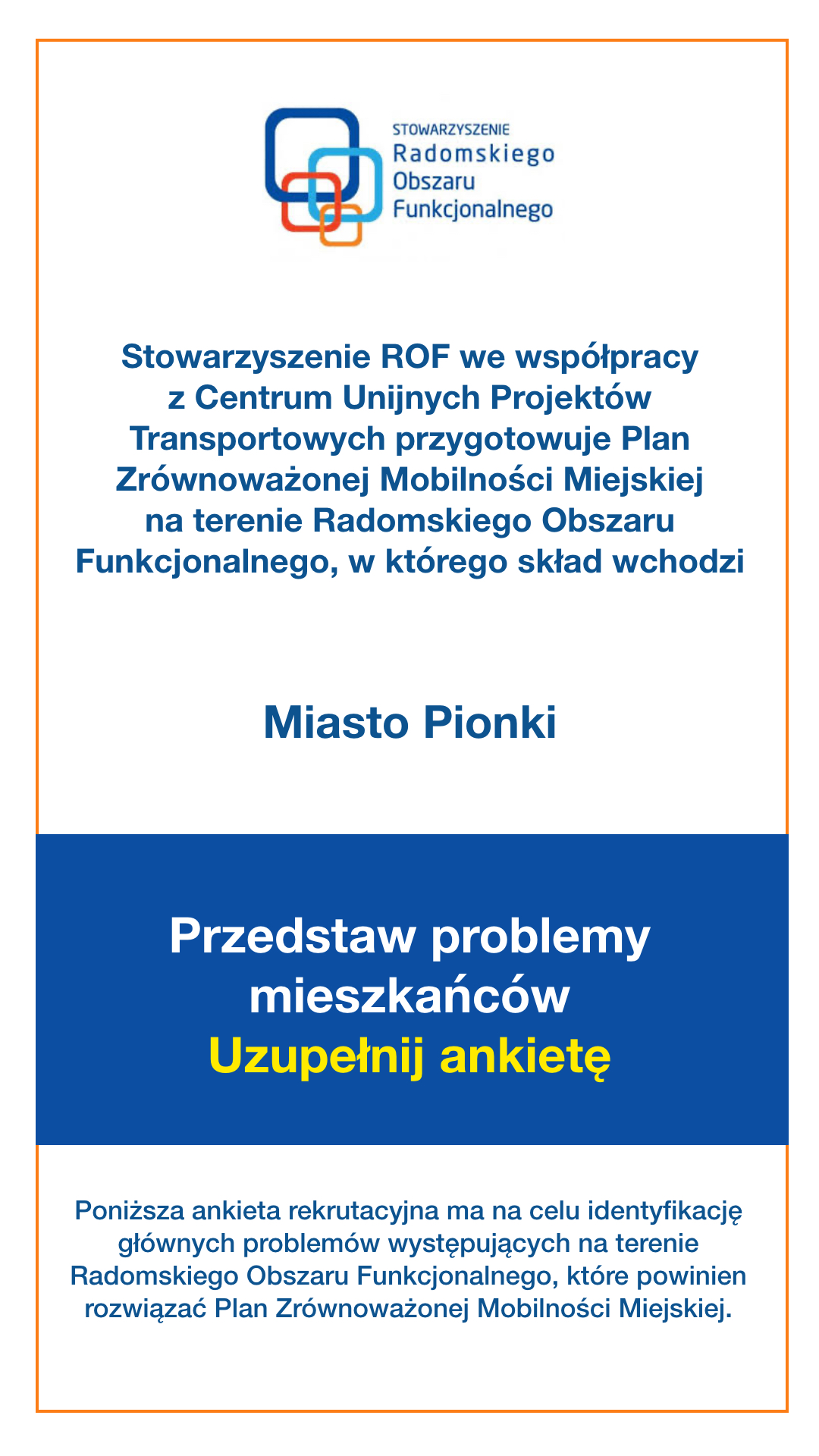Stowarzyszenie Radomskiego Obszaru Funkcjonalnego we współpracy z Centrum Unijnych Projektów Transportowych przygotowuje Plan Zrównoważonej Mobilności Miejskiej. To dokument, który ma uwzględniać potrzeby komunikacyjne, a jednocześnie kwestie związane z ochroną środowiska. W opracowaniu planu, oprócz ekspertów, mają także uczestniczyć sami mieszkańcy. Dlatego została przygotowana ankieta kierowana do wszystkich zainteresowanych. Zawiera ona szereg pytań dotyczących istniejących rozwiązań komunikacyjnych,